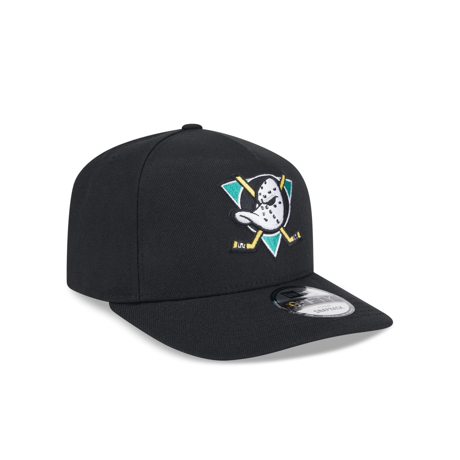 The Anaheim Ducks Team 9FIFTY A-Frame Snapback features an embroidered Ducks logo at the front panels with a matching NHL Shield at the rear, a snapback closure at the rear, and a gray undervisor.
