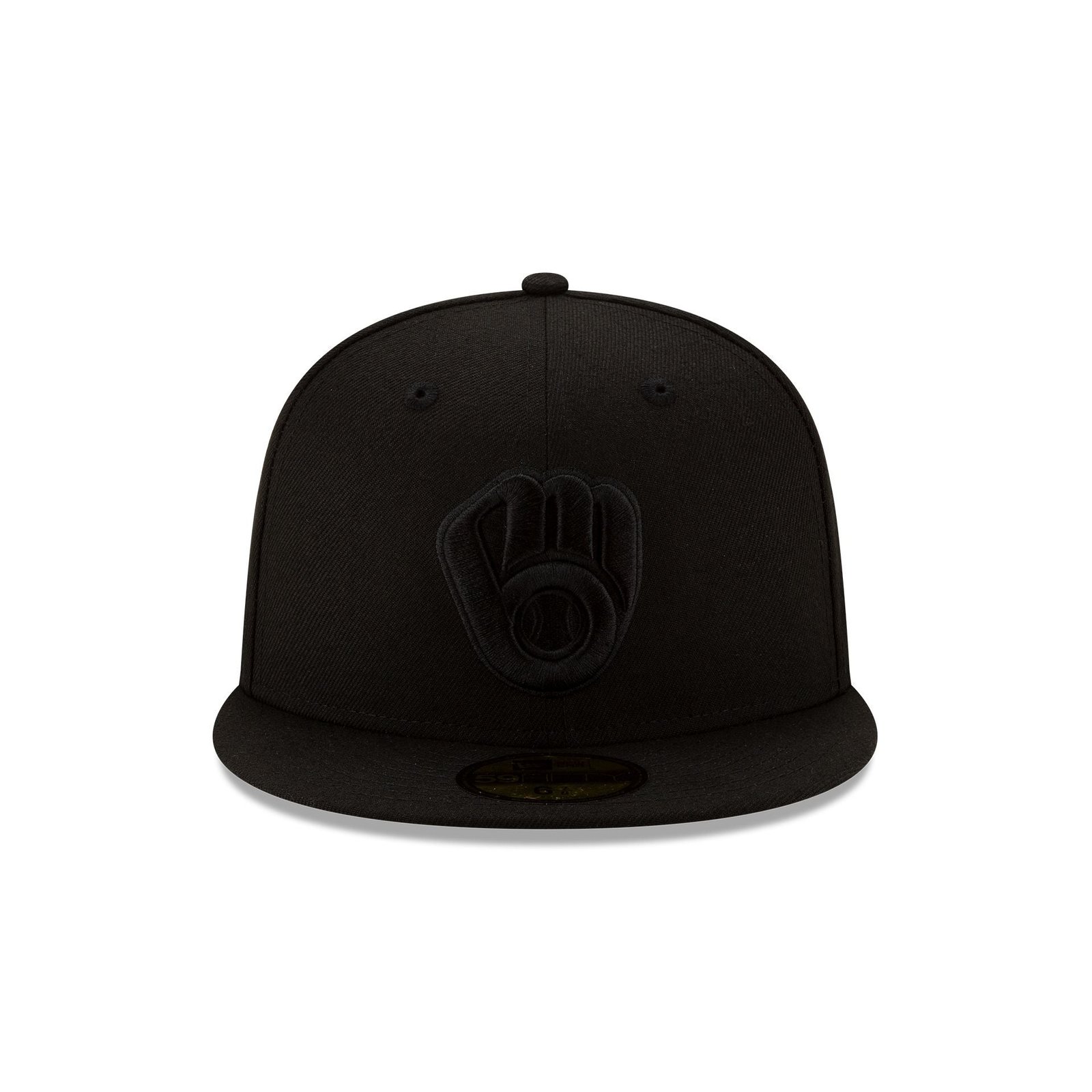 The Milwaukee Brewers Black on Black 59FIFTY Fitted features an embroidered Brewers logo at the front panels with a matching MLB Batterman logo at the rear.