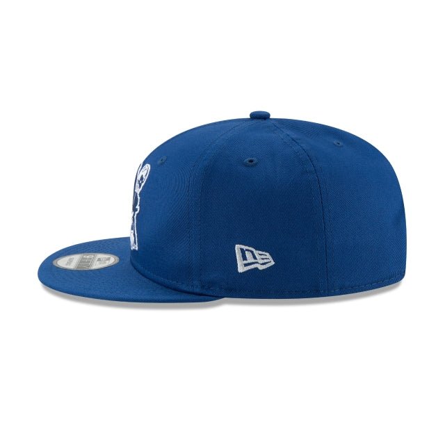 The Indianapolis Colts Historic 9FIFTY Snapback features a historic embroidered Colts logo at the front panels with a matching New Era Flag at the left wear side and an adjustable snapback closure at the rear.