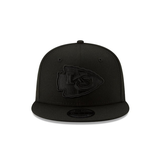 The Kansas City Chiefs Black on Black 9FIFTY Snapback features an allover black fabrication with an embroidered Chiefs logo at the front panels and an adjustable snapback closure at the rear.