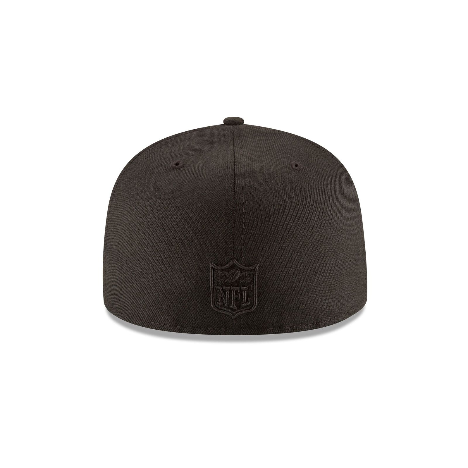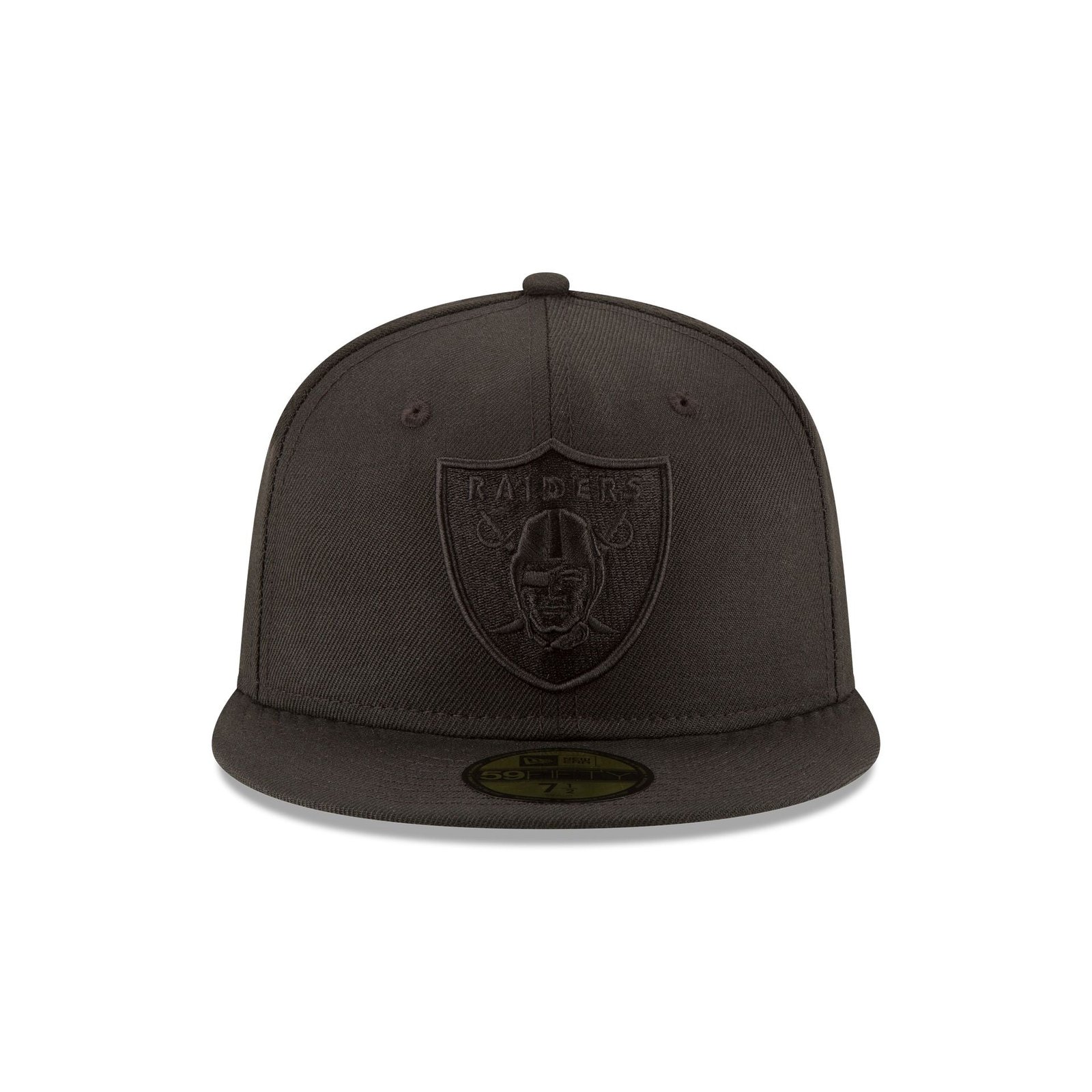 The Las Vegas Raiders Black on Black 59FIFTY Fitted Cap features a Raiders logo embroidered on the front panels and NFL Shield at the rear in matching, tonal black embroidery.
